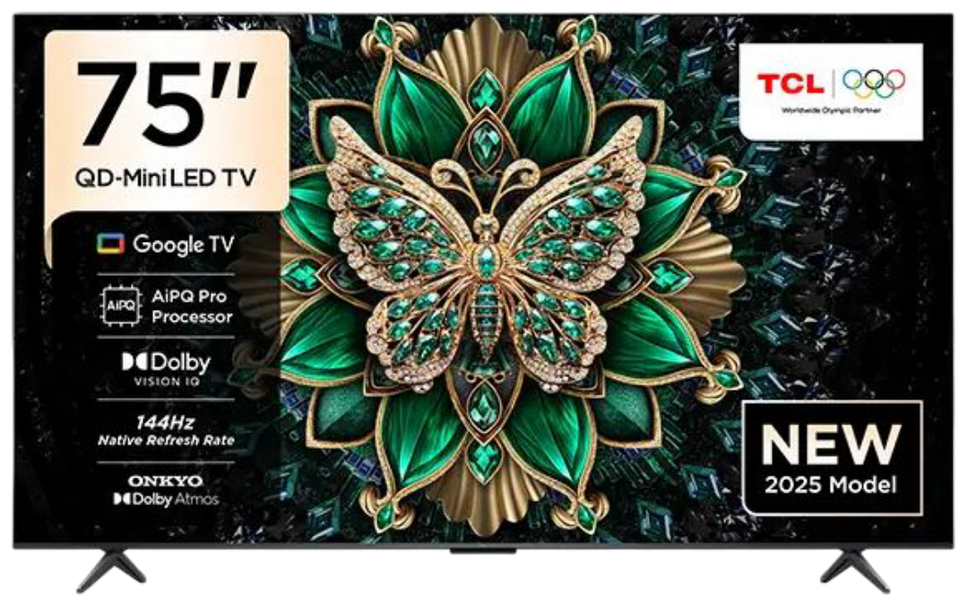 TCL 75 Inch QD Mini LED 4K Google TV – Resolution 3840 x 2160 (4K UHD), Native Refresh Rate 144Hz , Color Gamut 93% DCI-P3, HDR Support Dolby Vision IQ, HDR10+, HLG, Contrast Ratio 5500:1, Peak Brightness up to 1000 nits. Audio: ONKYO 2.1 Hi-Fi system with 2x10W midrange speakers and 20W subwoofer, Processor AiPQ Pro for advanced image processing, Operating System Google TV with Google Assistant. Connectivity includes 4x HDMI 2.1 (eARC/ARC), USB 2.0/3.x, Ethernet LAN, dual-band Wi-Fi, Bluetooth 5.4. Dimensions without stand: approx. 1890 x 1086 x 57.9 mm; with stand: 1890 x 1161 x 372 mm, Weight approx. 23 kg, VESA mount 600 x 400 mm. Warranty 3 years.
